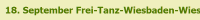 Am 18. September findet der 53.-te FreiTanz statt. ..... Eintritt: 10,00 Euro (Ticket gilt für Veranstaltungen am 17. + 18. September) Kulturforum Friedrichstr. 16.... 65185 Wiesbaden Stadtplan hier Termine können sich auch ändern! Bitte ab- und an hier schauen oder Newsletter bestellen!