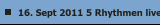 5 Rhythmen(TM) -Tanz mit Live-Musik 5Rhythmen An diesem Abend führen uns Heera Andreas Müller (autorisierter 5 Rhythmen Lehrer) und die Musiker Thomas Klöwer & Volker Kaczinski ( ZenBeat ) in die Tanz- und Bewegungswelt der 5 Rhythmen. Bei der Live-Wave entstehen Musik und Tanz aus dem Moment und inspirieren sich gegenseitig, ein einzigartiges Erlebnis, frei von bekannten musikalischen Mustern und Erinnerungen.